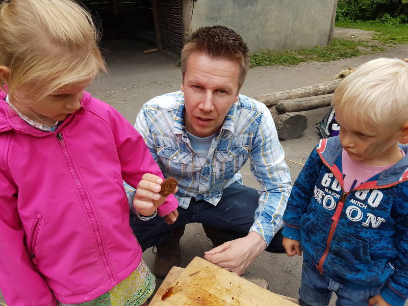 Het fijngemalen graan wordt met een schep honing en een beetje water veranderd in een deeg. Dat gaat in de pan op het vuur en we hebben een koekje. Het prehistorisch dorp is een keigaaf levend museum. Mooi om daar met z’n vieren van te genieten. Perfecte vaderdag!