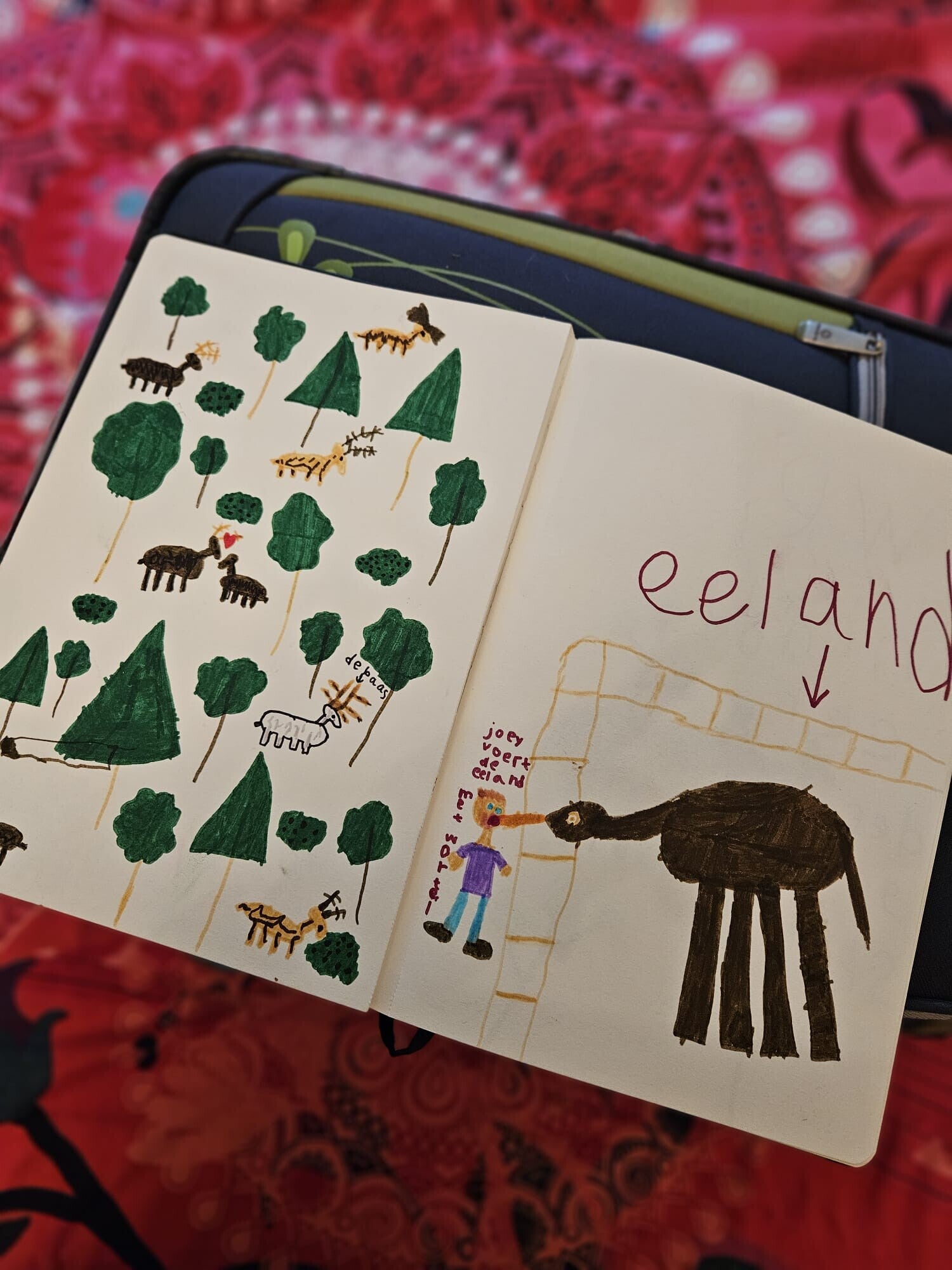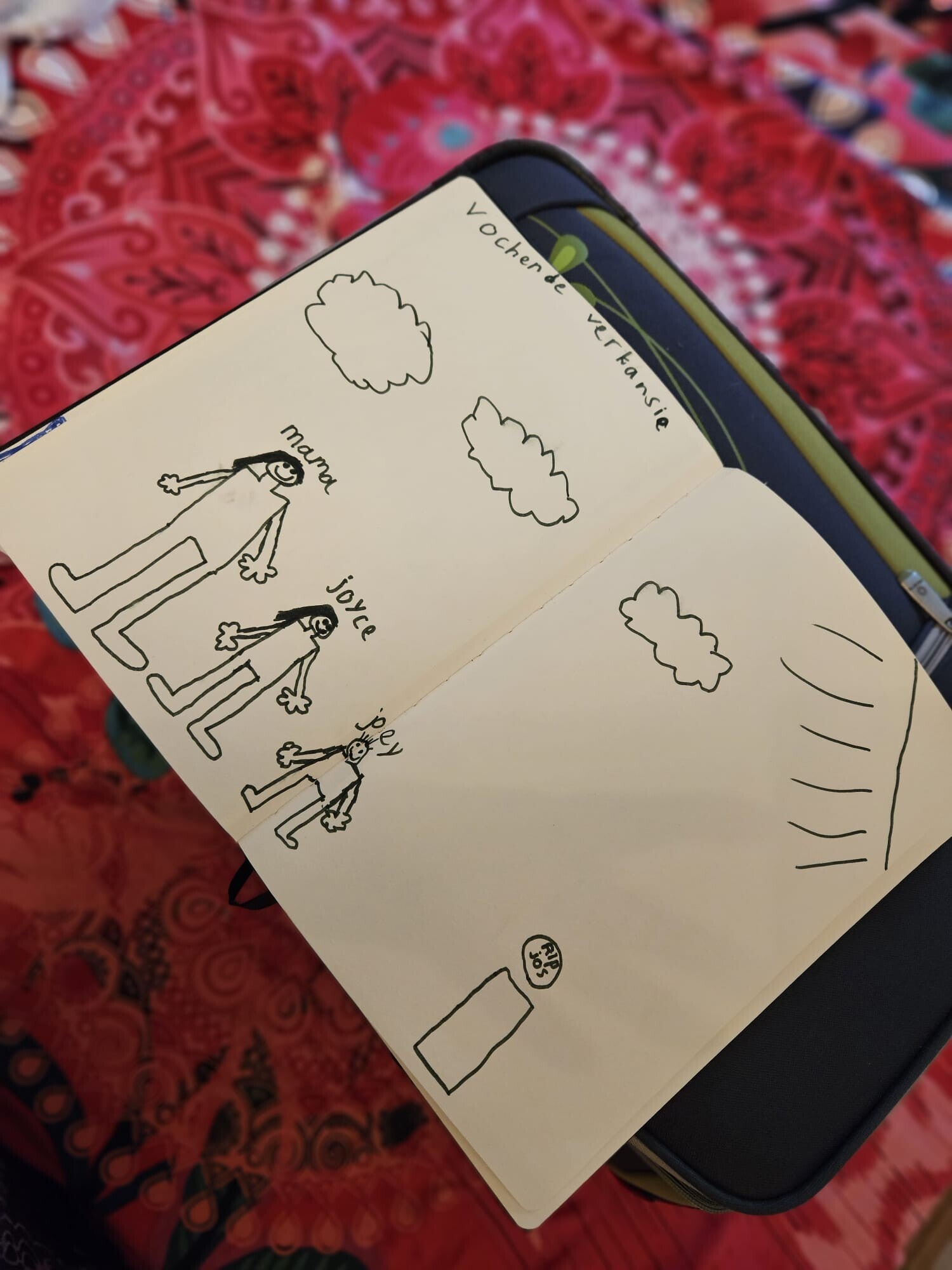Vandaag is Joey zijn boek aan de beurt wat hij mee wil nemen om tijdens de busreis zijn reisverslag in te gaan maken. Het boek erbij gepakt en daarin de vakantie van Zweden bekeken vanuit zijn perspectief en leuke herinneringen opgehaald. Dan op de laatste blz. een tekening alvast voor de volgende vakantie, waarbij hij zelf ook wel even moest huilen toen hij deze zag. Papa is elke dag nog bij ons en soms overvalt het ons zelf als verassing waar we heel blij van worden en soms worden we even geconfronteerd met het feit dat wij gewoon door zijn gegaan en papa fysiek niet meer mee kan op vakantie. Elke vakantie gaat het spel beverbende mee en hoe leuk is het dan als je in Italië bent of in de buurt en dat papa er dan toch even een soort van bij is. Verdriet en Joy liggen heel dicht bij elkaar en met de woorden van Joey dat papa ook niet gewild zou hebben dat we alleen maar zouden huilen, gaan we genieten van onze vakantie en nog meer van de voorbereidingen.