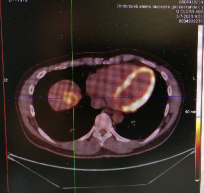 Daarom wordt met de CT-scan via de computer gecombineerd met de PET-scan. Het resultaat is een PET/CT-scan. Hierbij zie je duidelijk de tumor in mijn lever oplichten. Ook zie je dat mijn hart actief is en oplicht. De artsen kunnen letterlijk langs alle kanten door deze plaatjes scrollen en zo een duidelijk beeld krijgen van de vorm en de locatie van de tumor.