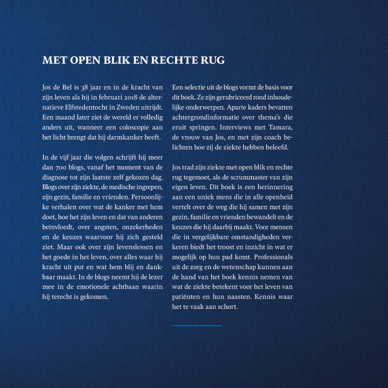 Jos wilde heel graag een boek schrijven over het proces wat hij samen met ons meemaakte rondom zijn diagnose darmkanker om andere mensen te inspireren en te helpen. Hij heeft ruim 700 blogs geschreven en ook al de inleiding en proloog, a.h.v al deze informatie hebben wij het boek een jaar na zijn overlijden afgemaakt tot dit mooie indrukwekkende persoonlijke verhaal.